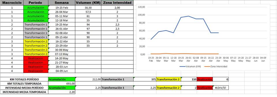 - Distribución de las Cargas de Trabajo: Distribuir las cargas de forma racional en el tiempo, cantidad y forma adecuada para llegar en un estado de forma óptimo a las competiciones principales (se aporta una gráfica con el control de carga).